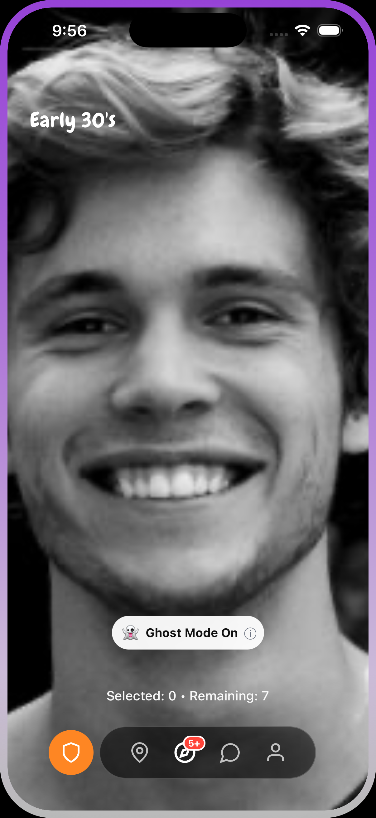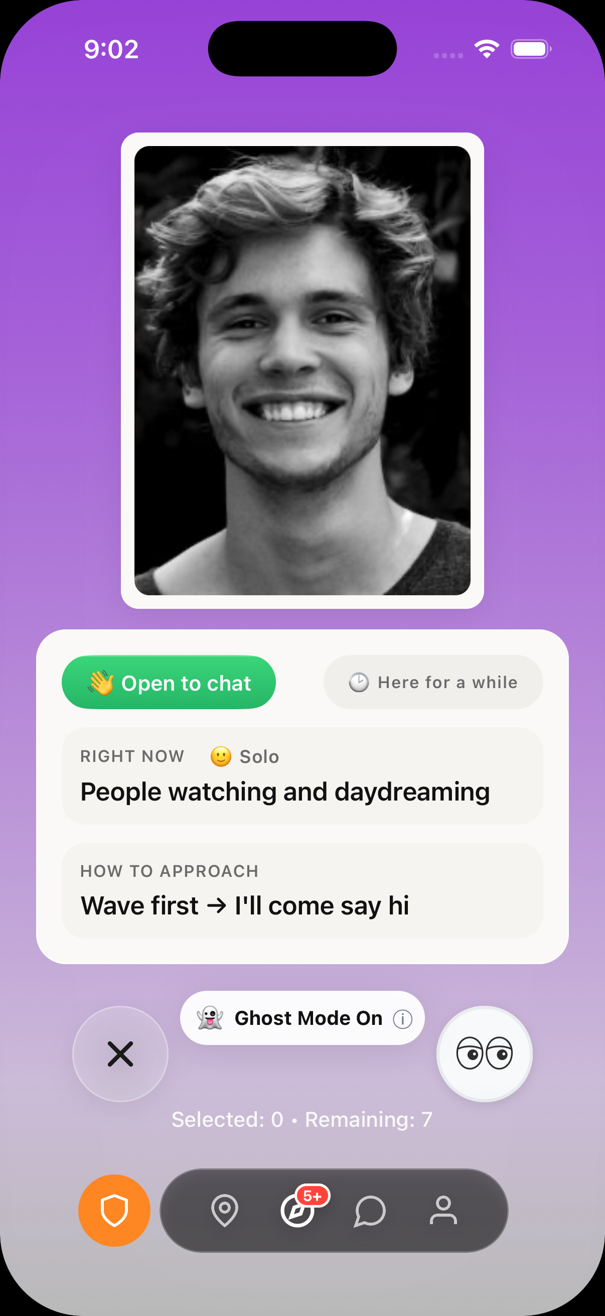 Your name, exact age, and location stay private until you choose to share. You're only visible when you check in — no tracking, no history.